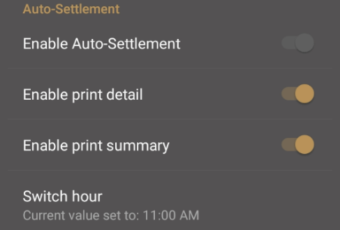 If your terminal is equipped with a printer, you can adjust the printer settings to suit your business needs. The available printing options are: